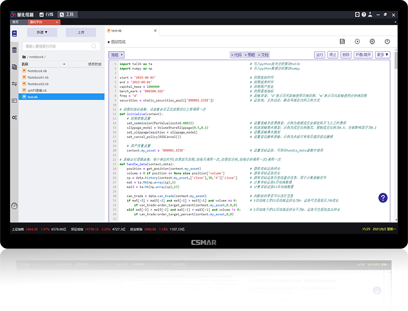 内置数种策略模板代码,从双均线、布林带等简单策略到涵盖股票、期货、期权等不同品种的复杂混合策略,帮助用户更快熟悉量化交易的策略思想和代码实现,为下一步的策略研究给予基础和参考。